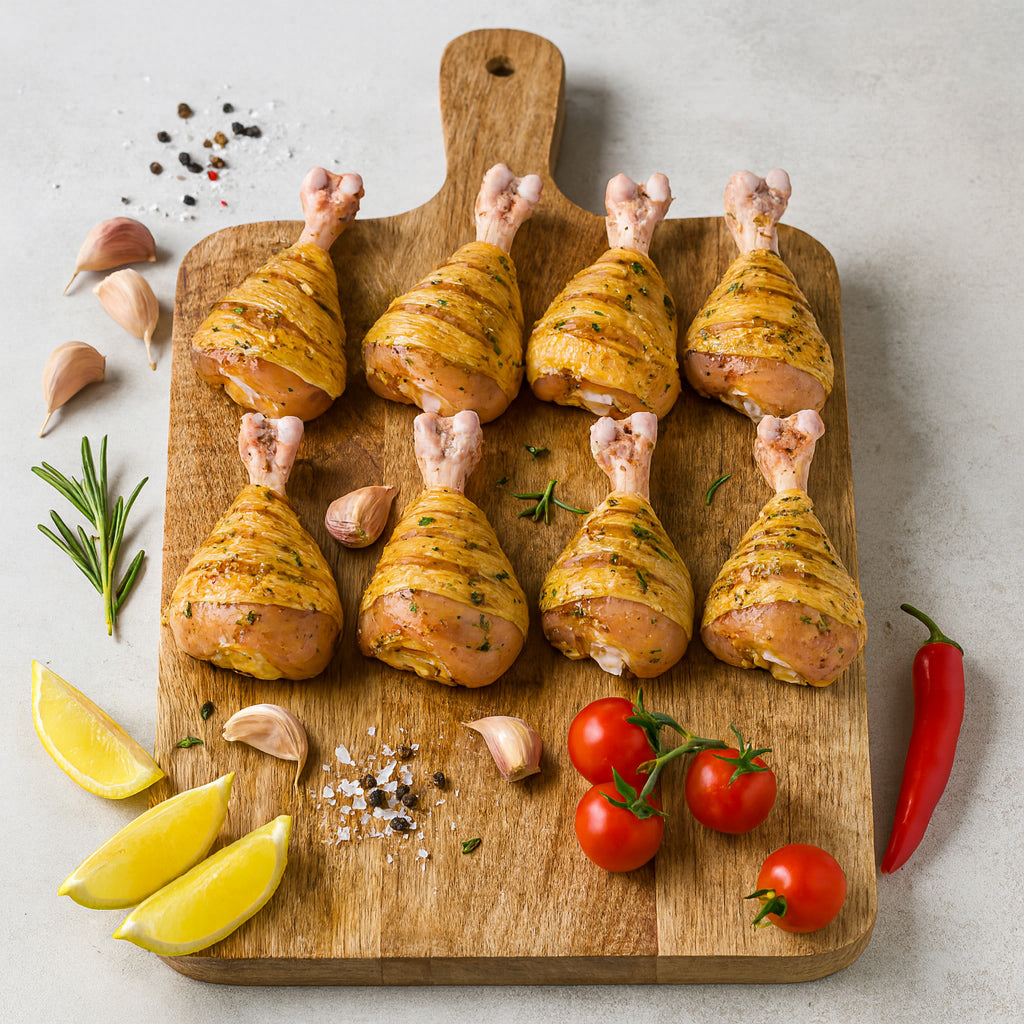 Marinated chicken drumsticks are pre-seasoned with a balanced marinade. This preparation allows the meat to absorb the flavors, resulting in a richer taste and an even juicier texture after cooking.