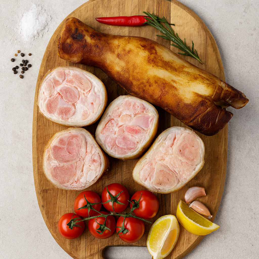 Le pied de veau est un abat issu de la partie inférieure de la patte du veau. Il est particulièrement apprécié pour sa richesse en collagène, qui donne une texture fondante après cuisson et apporte une consistance naturellement gélatineuse aux plats.